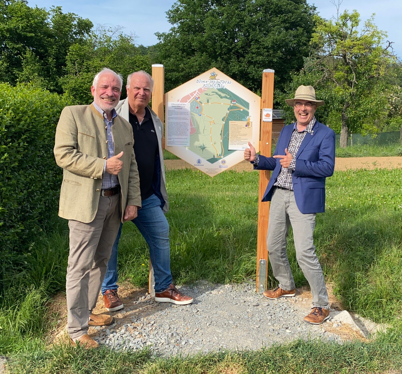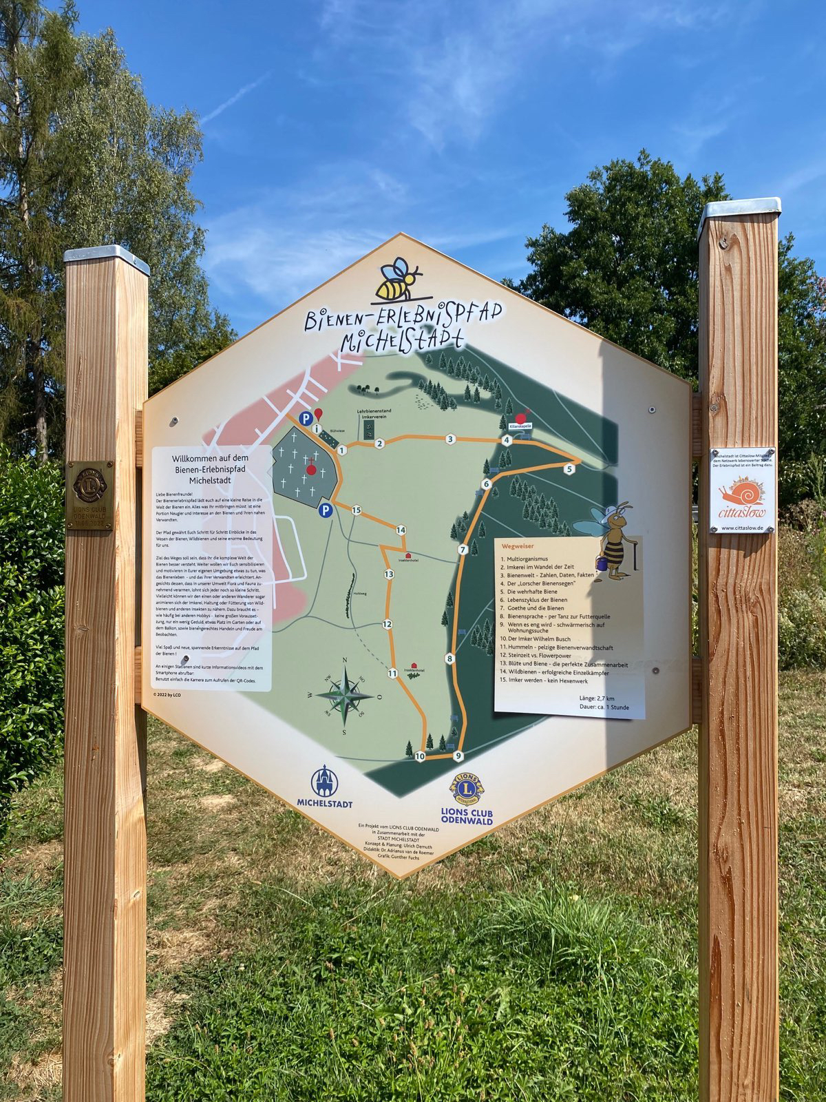 „Wir wollen deutlich machen, welche Rolle Bienen und Blühwiesen für das gesamte Ökosystem haben“, berichtet Ulrich Demuth vom Lions Club Michelstadt. Anlass ist die Einweihung des ersten Multimedia Bienen-Erlebnispfads rund um den Ort, der sich inzwischen stolz „Bienenstadt“ nennt. Der als Lions-Projekt entstandene Pfad im Odenwald bietet mit seinen 2,7 Kilometern herrliche Ausblicke auf das schöne Mümlingtal, auf Streuobstwiesen und führt an einem Lehrbienenstand für Imker vorbei. „Der Pfad soll gleichermaßen interessant für angehende Hobby-Imker wie auch für Interessierte sein“, erläutert Demuth, der das Konzept in seiner Zeit als Club-Präsident gemeinsam mit dem Didaktiker Dr. Adrian Van De Roemer und dem Grafiker Gunther Fuchs entwickelt hat. Rund 7.000 Euro flossen in das Projekt, 5.600 Euro vom Michelstädter Club und 1.400 Euro über den sogenannten Lions-Distrikt-Verfügungsfonds, den Clubs als Zuschuss beantragen können. Die Club-Mitglieder selbst leisteten beim Verankern und Aufstellen der Tafeln auch praktische Hilfe.