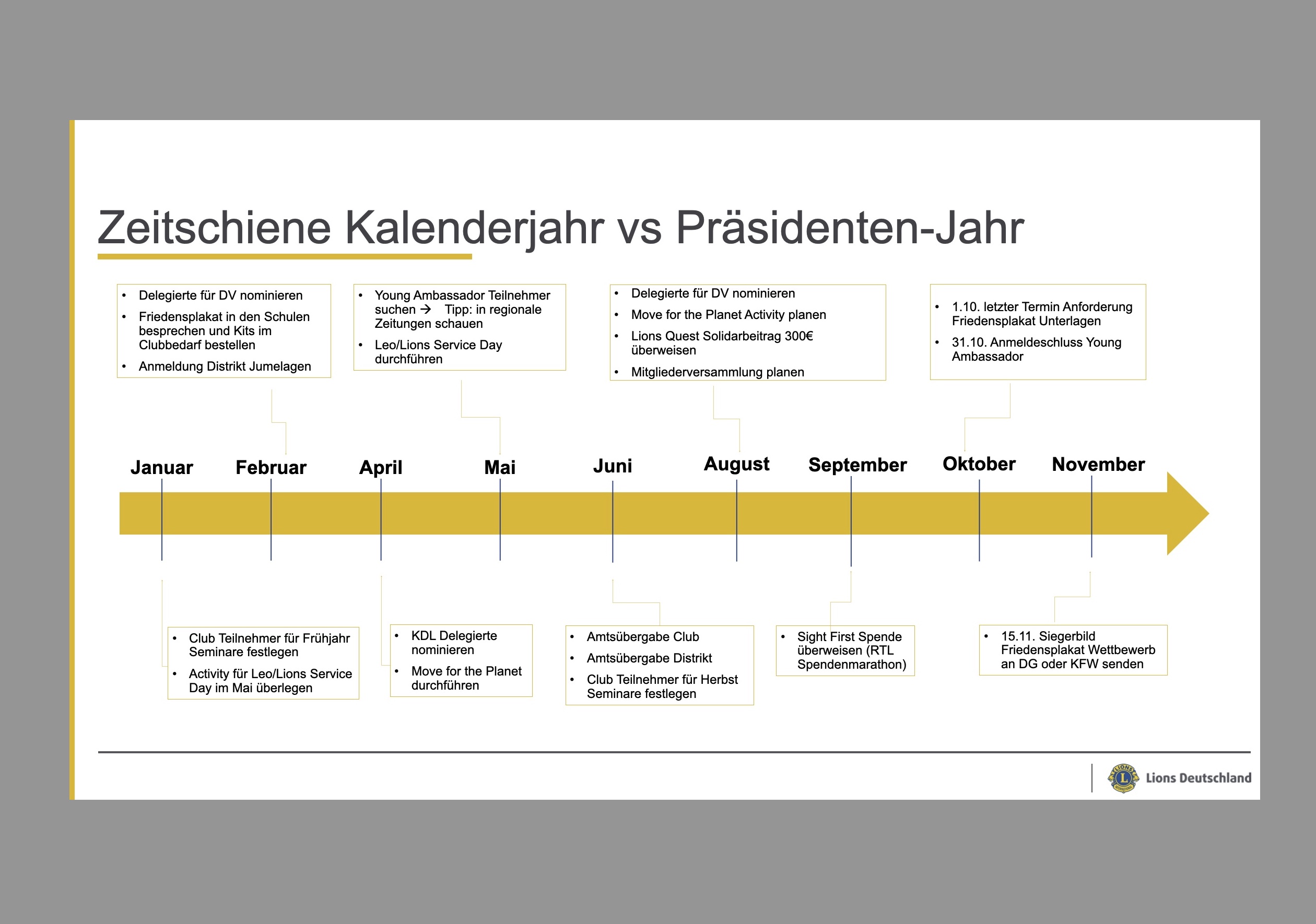 Hier kommt das Tandem P/VP ins Spiel! Der Startschuss fällt bereits im Frühjahr, genauso wie es die Natur uns vormacht: wir pflanzen im Frühjahr und ernten die Früchte im Herbst.  Der Zeitstrahl dient als visuelle Hilfeleistung, wann welche to do’s anstehen. Diese to do‘s werden übrigens auch beim Vize-Präsidenten Seminar ausführlich besprochen, nehmt an den Seminaren teil, es lohnt sich!